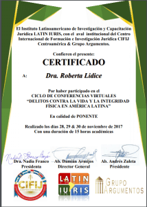 Honrada e agradecida pelo recebimento deste certificado, em razão de minha participação como Palestrante no Ciclo Internacional de Conferencias Virtuales “DELITOS CONTRA LA VIDA Y LA INTEGRIDAD FÍSICA EN AMÉRICA LATINA”, abordando o tema: