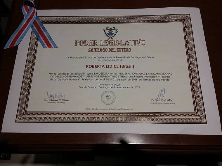 Honrada y sumamente agradecida en hacer parte de las “I Jornadas Latinoamericanas de Derechos Humanos y Humanitario” como representante de Brasil, así como recibir este certificado, en calidad de disertante en este importante Congreso Internacional, de las manos del Dr. José Emilio Jozami, Juez de Santiago del Estero.