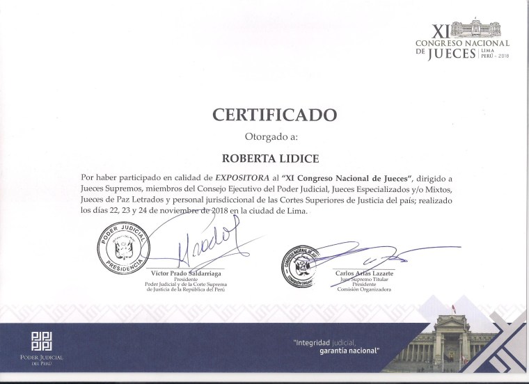 Honrada y agradecida en hacer parte del XI Congreso Nacional de Jueces del Poder Judicial del Perú, así como por haber recibido este diploma por parte del Juez de la Corte Suprema de Justicia, Sr. Dr. Carlos Arias Lazarte, en calidad de Expositora Internacional en este importante evento.