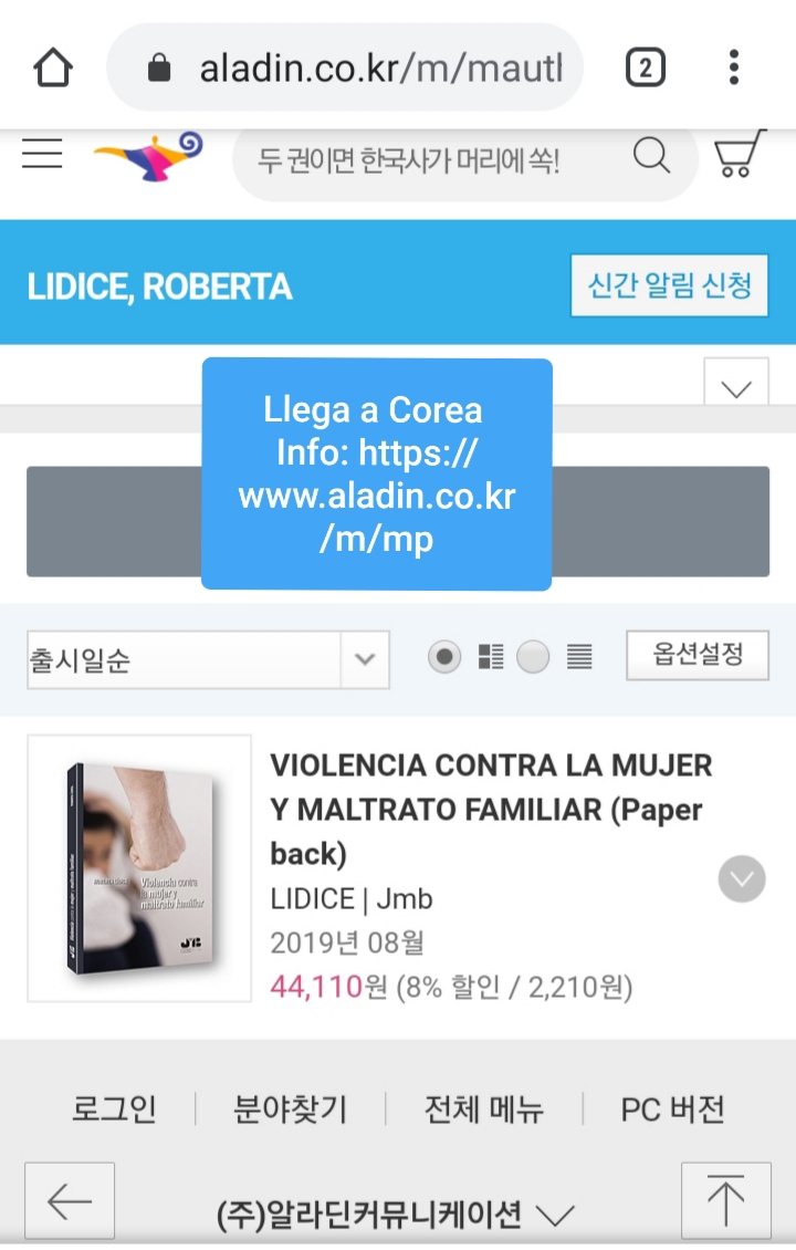 Les informamos que ha llegado a Corea el libro: “Violencia Contra La Mujer y Maltrato Familiar”, de la autora Roberta LÍDICE. Disponible en Aladin-Corea (Seúl, Corea del Sur).