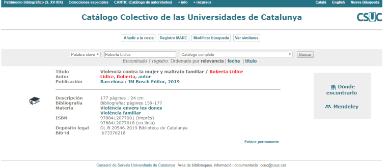Les indicamos el Catálogo Colectivo de las Universidades de Catalunya (CCUC), el cual recientemente ha incorporado a su acervo bibliográfico el Libro: “Violencia Contra la Mujer y Maltrato Familiar”, de la autora Roberta Lídice.