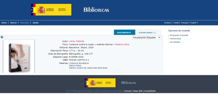 Les informamos que la prestigiosa Biblioteca del Ministerio de Justicia de España, recientemente ha incorporado a su impotante y notable acervo bibliográfico la obra: “Violencia Contra la Mujer y Maltrato Familiar”, de la autora Roberta LÍDICE.