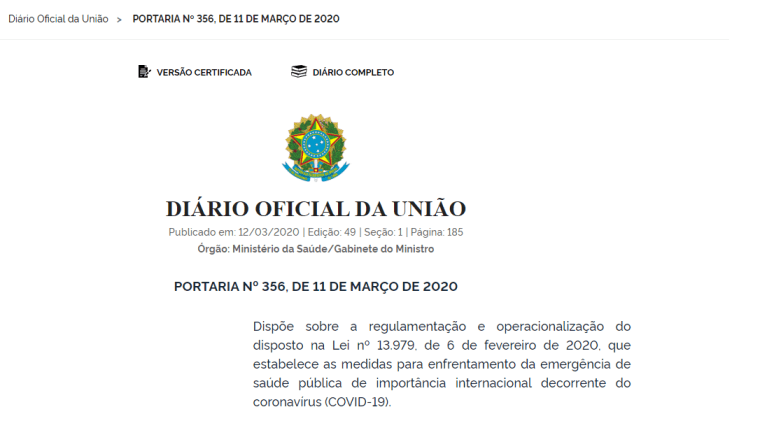 *Disponível em: <http://www.in.gov.br/en/web/dou/-/portaria-n-356-de-11-de-marco-de-2020-247538346>.