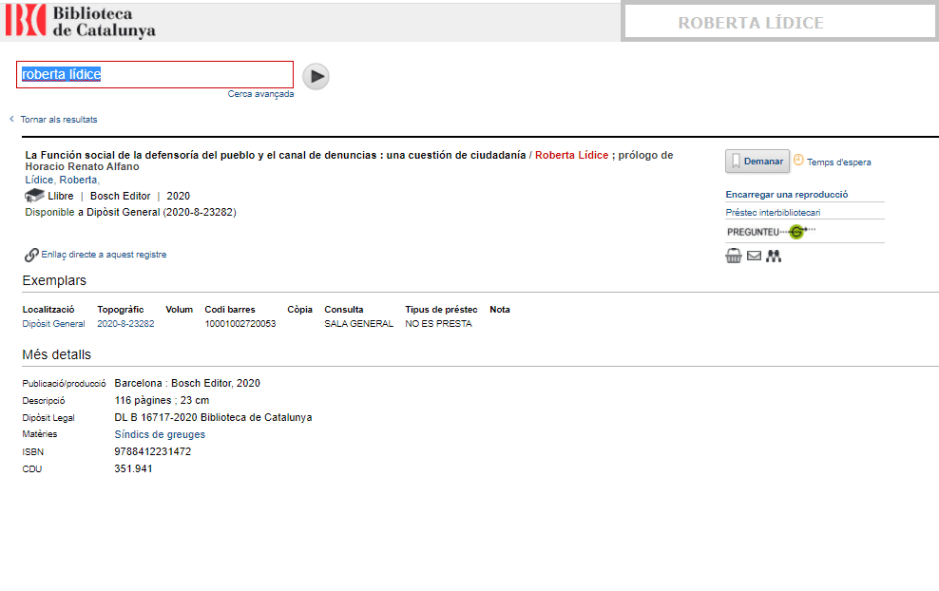 Les informamos que la prestigiosa Biblioteca de Catalunya ha incorporado a su importante y notable acervo el libro «La Función Social de la Defensoría del Pueblo y El Canal de Denuncias – Una Cuestión de Ciudadanía», de la autora Roberta LÍDICE.