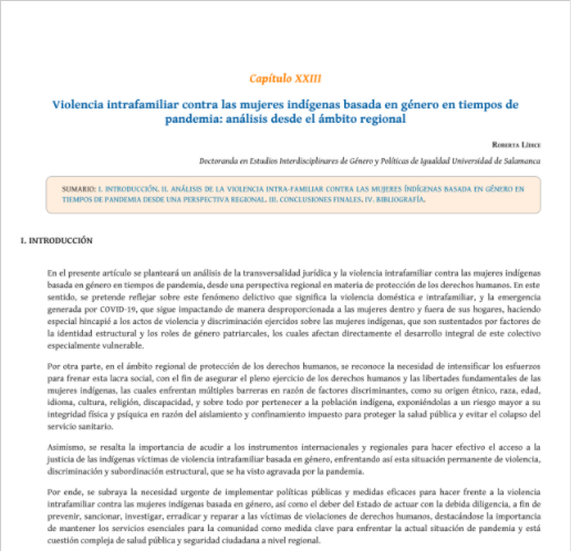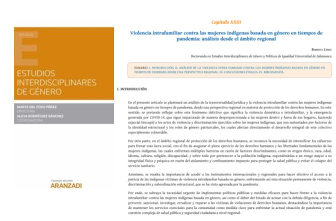 LÍDICE, Roberta. «Violencia intrafamiliar contra las mujeres indígenas basada en género en tiempos de pandemia: análisis desde el ámbito regional». En: DEL POZO PÉREZ, Marta (Dir.), RODRÍGUEZ SÁNCHEZ, Alicia (Coord.) Estudios interdisciplinares de género, 1ª ed. Navarra, España: Editorial Aranzadi – Thomson Reuters, jun.-2021. 880p. ISBN 9788413459837.