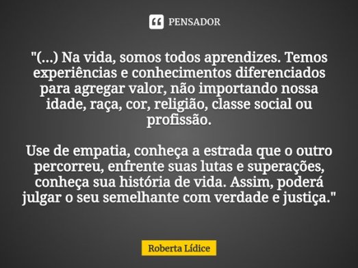 Na vida, somos todos aprendizes. Temos experiências e conhecimentos diferenciados para agregar valor, não importando nossa idade, raça, cor, religião, classe social ou profissão.