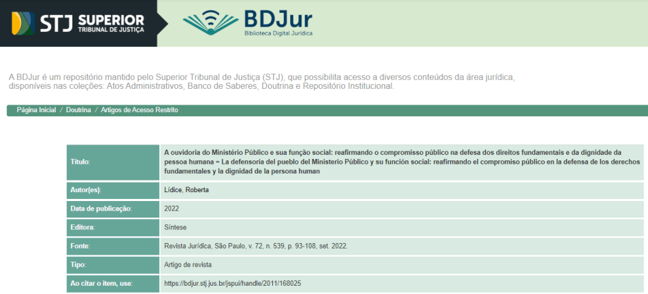 *Revista Jurídica: órgão nacional de doutrina, jurisprudência, legislação e crítica judiciária (ISSN 0103-3379), ed. 539/2022 | Texto: “A ouvidoria do Ministério Público e sua função social: reafirmando o compromisso público na defesa dos direitos fundamentais e da dignidade da pessoa humana” = La defensoría del pueblo del Ministerio Público y su función social: reafirmando el compromiso público en la defensa de los derechos fundamentales y la dignidad de la persona humana- Autora: Dra. Roberta LÍDICE.