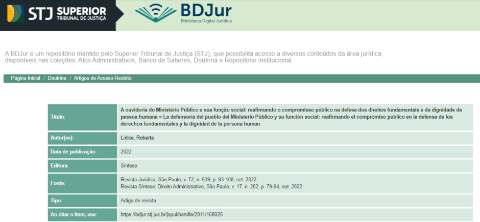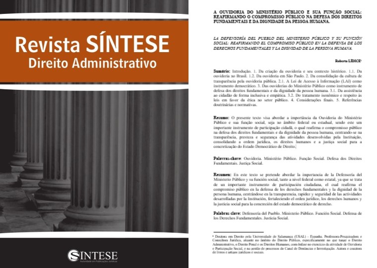 *Revista SÍNTESE Direito Administrativo (ISSN 2179-1651), ed. 202/out. 2022 | Texto: “A ouvidoria do Ministério Público e sua função social: reafirmando o compromisso público na defesa dos direitos fundamentais e da dignidade da pessoa humana” = La defensoría del pueblo del Ministerio Público y su función social: reafirmando el compromiso público en la defensa de los derechos fundamentales y la dignidad de la persona humana- Autora: Dra. Roberta LÍDICE.