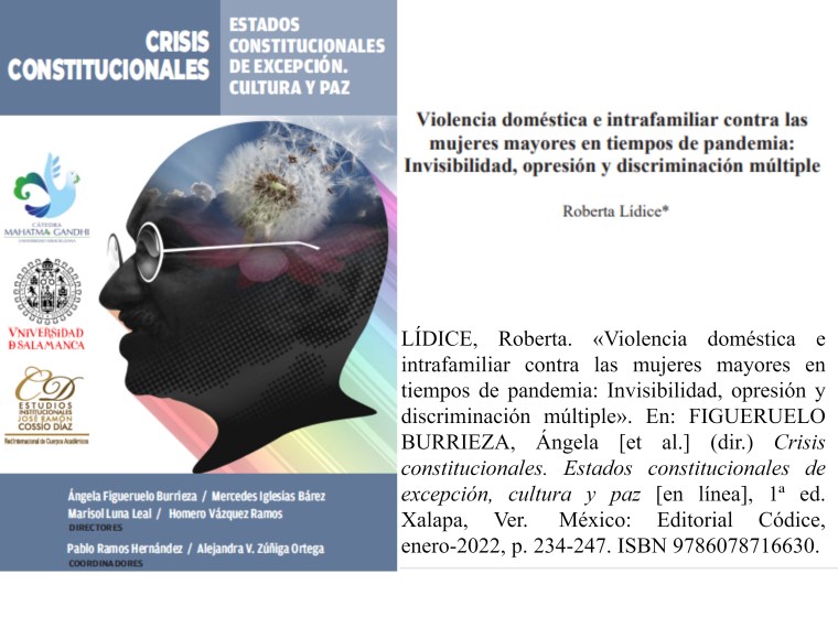 LÍDICE, Roberta. «Violencia doméstica e intrafamiliar contra las mujeres mayores en tiempos de pandemia: Invisibilidad, opresión y discriminación múltiple». En: FIGUERUELO BURRIEZA, Ángela [et al.] (dir.) Crisis constitucionales. Estados constitucionales de excepción, cultura y paz [en línea], 1ª ed. Xalapa, Ver. México: Editorial Códice, enero-2022, p. 234-247. ISBN 9786078716630. Disponible en: https://d-constitucional-usal.com/wp-content/uploads/2022/04/Crisis-Constitucionales-digital.pdf